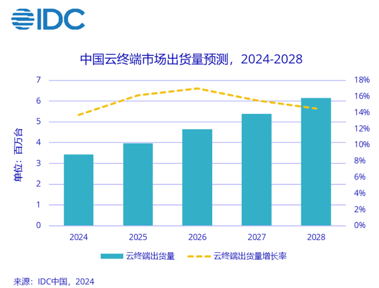2024年9月,国际数据公司IDC 发布了《2024 年上半年中国云终端市场跟踪报告》,报告显示:今年上半年中国云终端出货量达到 166.3 万台,同比增长 22.4%。随着涉足行业的增多,云终端在保持销量增长的同时,针对不同场景的云终端配置也在持续走向差异化。