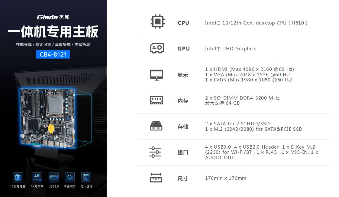 一体机在使用体验方面也有独特的优势:比笔记本屏幕大,比台式机更简洁,也解决了一直为人诟病的台式机线缆多而杂的问题,另外,随着计算机硬件和制造工艺的不断发展,一体机的性能也在不断提高,因此,越来越多的教育办公、日常娱乐和学习的用户选择使用一体机。Giada球王会·(体育)科技根据市场与客户需求,推出这款高性能的一体机专研主板CB4-8121,带来全新震撼体验。