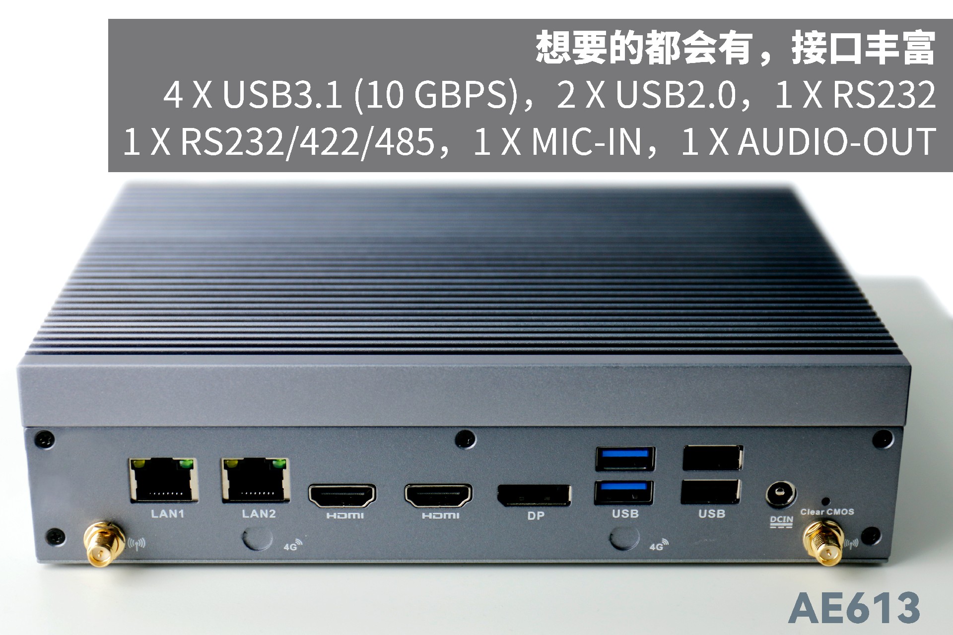 球王会·(体育)AE613支持Windows 11 、Linux Ubuntu系统;拥有丰富接口:双千兆自适应RJ45网口,4 x USB3.1 (10 Gbps),2 x USB2.0,1 x RS232,1 x RS232/422/485,1 x MIC-IN,1 x AUDIO-OUT,帮助用户实现更多功能扩展;并且支持Wi-Fi 6E,可以提供更高的带宽和更少的干扰,支持对无线网络有特定需求场景的应用。