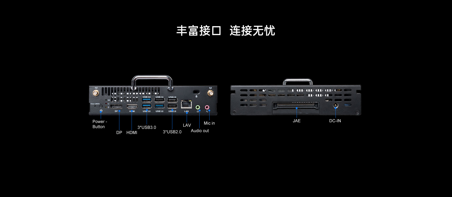 1 x JAE(HDMI),1 x  DP, 1 x HDMI显示,支持4K60Hz显示